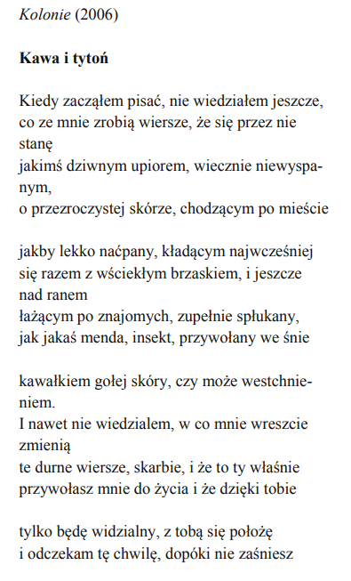 Omów, w jaki sposób w wierszu Tomasza Różyckiego Kawa i tytoń poeta przedstawia destrukcyjny wpływ twórczości na życie i tożsamość podmiotu lirycznego. Wskaż, jaką rolę w przezwyciężeniu tego kryzysu odgrywa adresatka wiersza. W swojej wypowiedzi odwołaj się również do wybranego tekstu kultury.