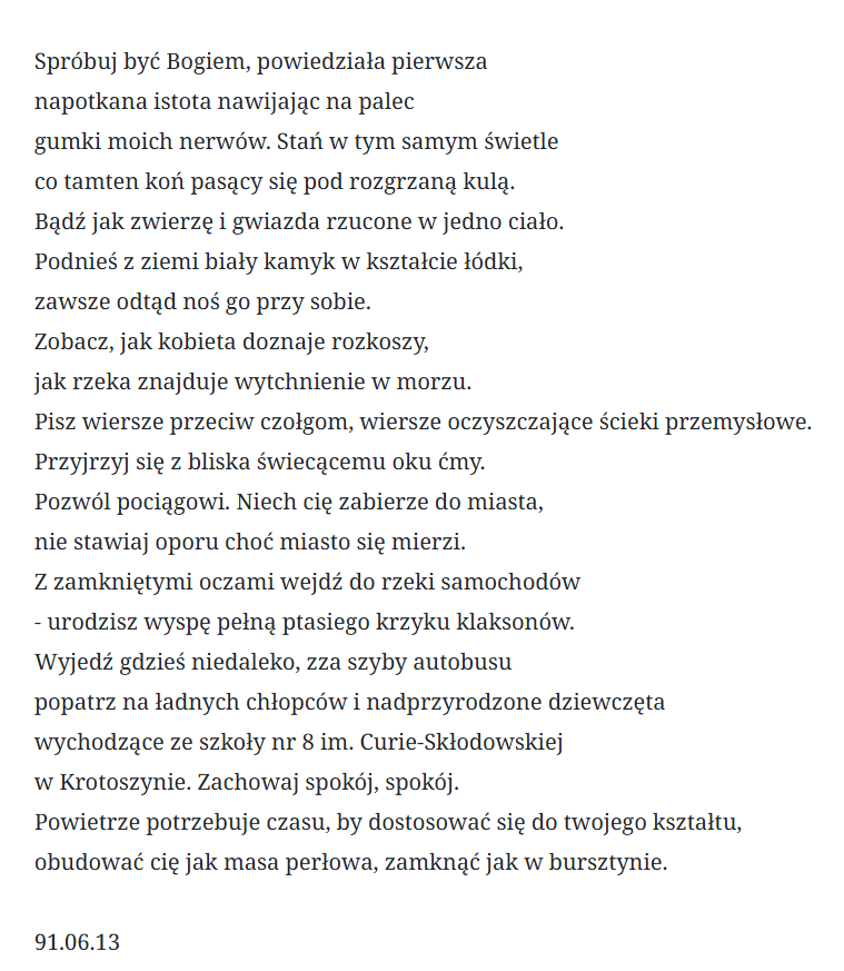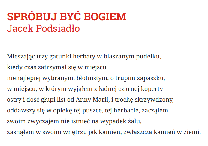 Rola poety i twórczość w obliczu kryzysu. Omów, w jaki sposób w wierszu Jacka Podsiadły Spróbuj być Bogiem przedstawiona jest rola poety i akt twórczy. W swojej wypowiedzi porównaj tę postawę i koncepcję tworzenia z dowolnie wybranym kontekstem kulturowym.
