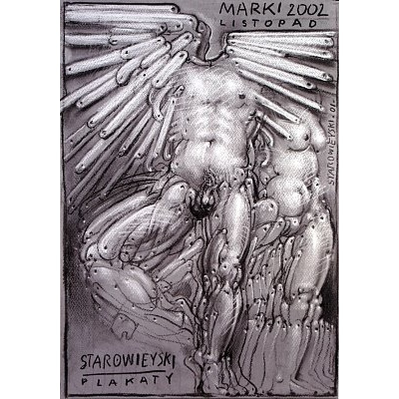 W jaki sposób twórczość Franciszka Starowieyskiego, widoczna w jego plakatach, wykorzystuje motywy cielesności i groteski do reinterpretacji tematów kulturowych, a jednocześnie czerpie z estetyki i idei antycznych. W swojej wypowiedzi odwołaj się do: dołączonego dzieła plastycznego (plakatu) oraz ogólnej estetyki Starowieyskiego, wybranego tekstu kultury (literackiego lub innego tekstu kultury) z kręgu lektur obowiązkowych lub innych tekstów (np. dramatu antycznego, rzeźby greckiej, mitu), oraz własnego doświadczenia i przemyśleń.