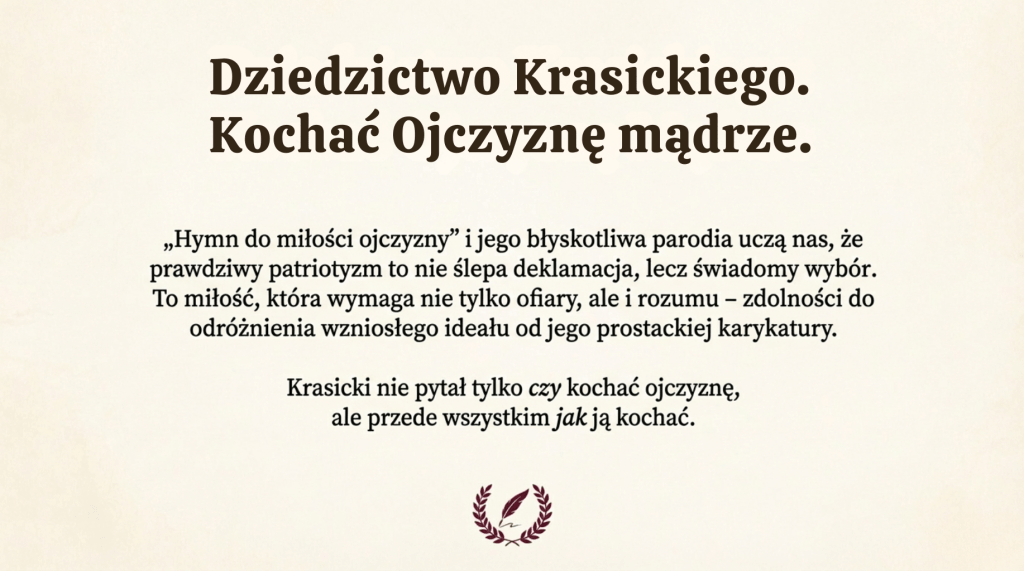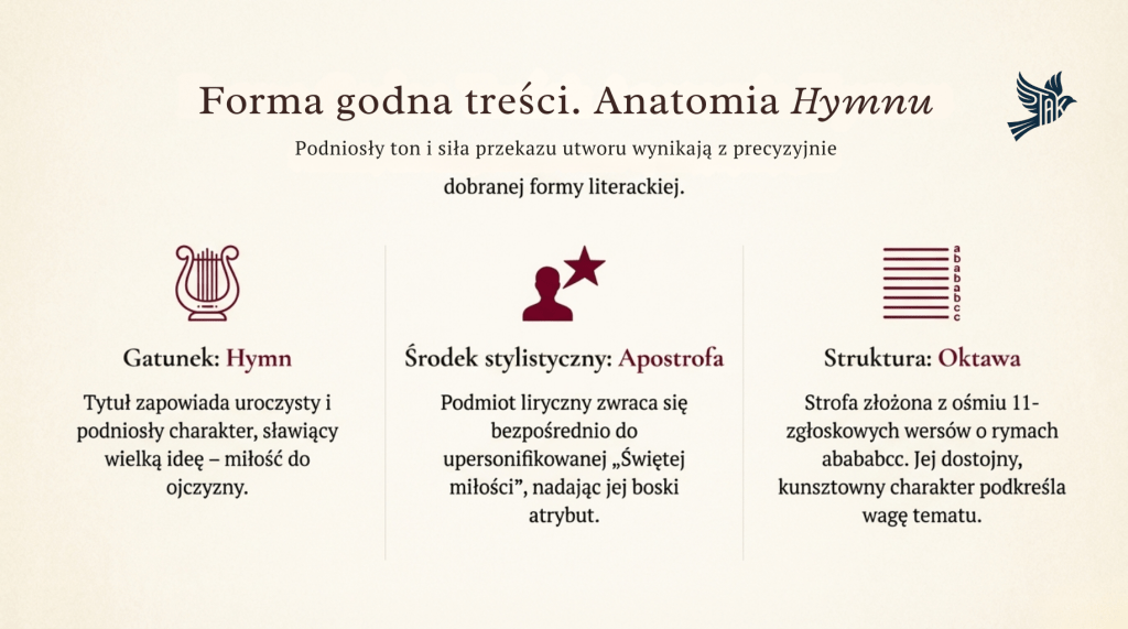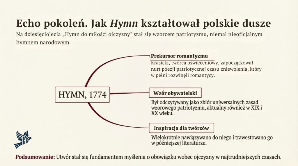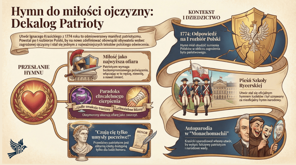 „Hymn do miłości ojczyzny” to arcydzieło poetyckiej zwięzłości, w którym forma i treść tworzą nierozerwalną całość. Uroczysty ton hymnu i zdyscyplinowana struktura oktawy idealnie współgrają z bezkompromisowym, patriotycznym przesłaniem. Krasicki, używając sugestywnych środków stylistycznych – apostrofy personifikującej miłość, anafory podkreślającej oddanie i oksymoronów nadających sens cierpieniu – stworzył niezwykle emocjonalny i poruszający obraz postawy obywatelskiej.