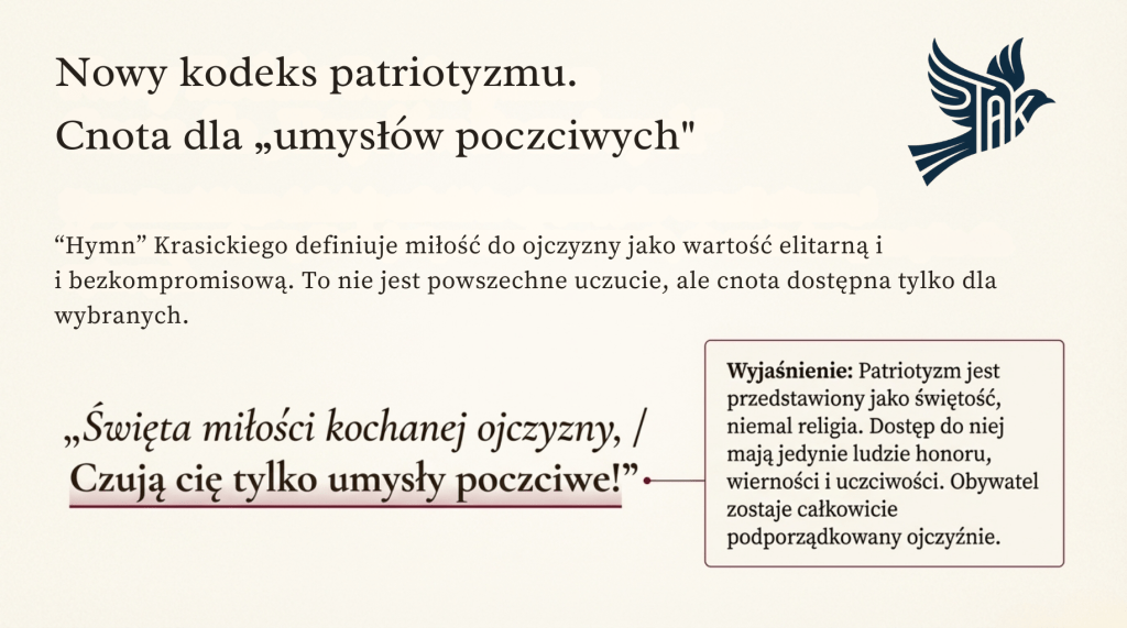 • Wprowadza elitarność tego uczucia: Miłość do ojczyzny nie jest dostępna dla każdego. Mogą jej doświadczyć tylko „umysły poczciwe”, czyli ludzie honorowi, szlachetni i uczciwi.