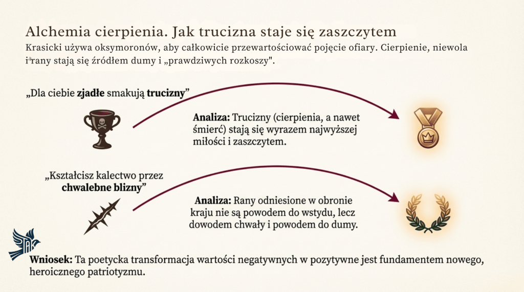 Krasicki używa ich, aby pokazać, jak miłość do ojczyzny przewartościowuje cierpienie i zmienia je w zaszczyt. Poniższa tabela pomaga zrozumieć ten mechanizm.