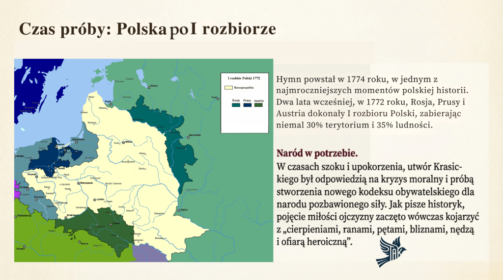 Ignacy Krasicki to jedna z czołowych postaci polskiego oświecenia. Jego twórczość, charakteryzująca się precyzją, humorem i głęboką refleksją nad ludzką naturą, na stałe wpisała się do kanonu polskiej literatury. „Hymn do miłości ojczyzny” powstał w 1774 roku, w niezwykle trudnym dla Polski momencie historycznym – zaledwie dwa lata po I rozbiorze (1772).