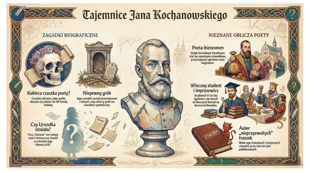 Niedawne odkrycia, historyczne osobliwości oraz ponowna analiza jego życia i twórczości malują o wiele dziwniejszy, bardziej złożony i głęboko ludzki obraz. Od szokującego odkrycia dotyczącego czaszki w jego grobowcu, po cięty dowcip z życia towarzyskiego, człowiek, którego myśleliśmy, że znamy, rozpływa się w serii fascynujących sprzeczności. Oto kilka najbardziej zaskakujących faktów, które podważają legendę Jana Kochanowskiego.