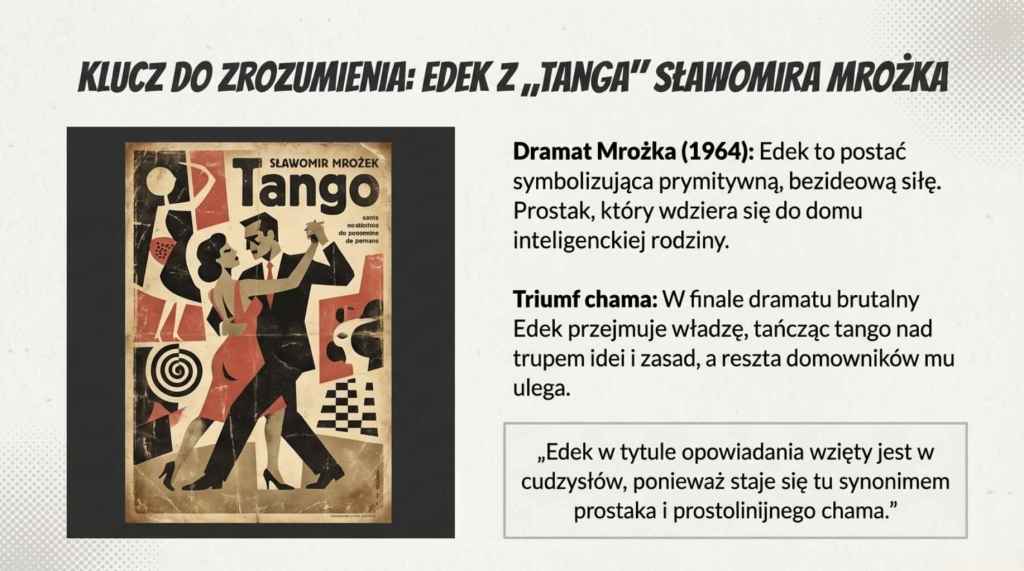 W dramacie Sławomira Mrożka Edek to prymitywny, prostacki osobnik pozbawiony wszelkich norm. Wprowadza się do inteligenckiej rodziny, gdzie początkowo jest tolerowany, by ostatecznie – dzięki sile fizycznej i braku skrupułów – przejąć władzę. Jego triumf symbolizuje zwycięstwo brutalnego chamstwa nad światem kultury, intelektu i zasad, prowadząc do ustanowienia nowego, prymitywnego porządku.