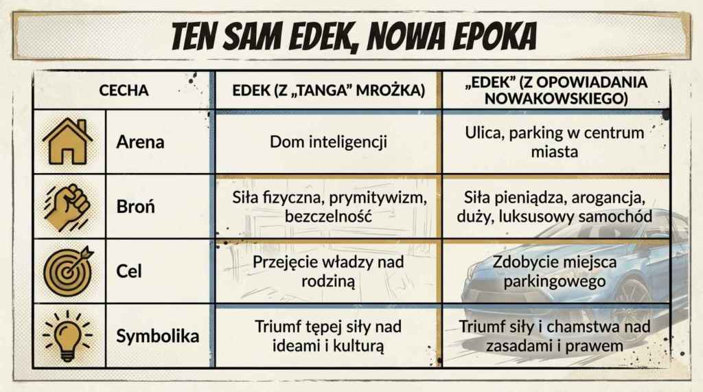 Nawiązując do Mrożka, Nowakowski pokazuje, że problem triumfu brutalnej siły nad kulturą jest ponadczasowy. Aluzja nie służy jedynie wskazaniu podobieństwa charakterów. Jest to przede wszystkim ostrzeżenie: zwycięstwo jednego „Edka” na jednej ulicy to symptom znacznie szerszego procesu społecznego. Podobnie jak w Tangu, gdzie upadek starych wartości stworzył próżnię, którą wypełniła dyktatura siły, tak w Polsce lat 90. chaos transformacji staje się polem do popisu dla współczesnych „Edków”. Prozaiczna scena walki o parking zostaje podniesiona do rangi uniwersalnej przypowieści o tym, jak stary porządek jest brutalnie zastępowany przez nowy.