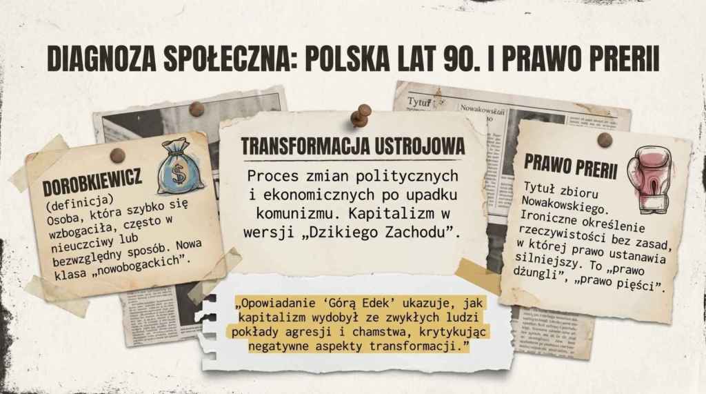 Ta zmiana reguł gry w sposób szczególny wpłynęła na pozycję inteligencji. W latach 80. inteligent, choć prześladowany, był nosicielem wartości i potencjalnym liderem oporu. W brutalnych realiach drapieżnego kapitalizmu jego etos – oparty na kulturze i poszanowaniu norm – okazał się całkowicie anachroniczny i dysfunkcjonalny. Postać kierowcy Fiata, upokorzonego i bezradnego, symbolizuje marginalizację całej warstwy społecznej, której kapitał kulturowy przegrał w starciu z siłą i pieniądzem. Proza Nowakowskiego dokumentuje bolesne przejście od społeczeństwa, które w obliczu wspólnego wroga potrafiło budować więzi solidarności, do społeczeństwa zatomizowanego, w którym brutalna rywalizacja zastąpiła poczucie wspólnoty.