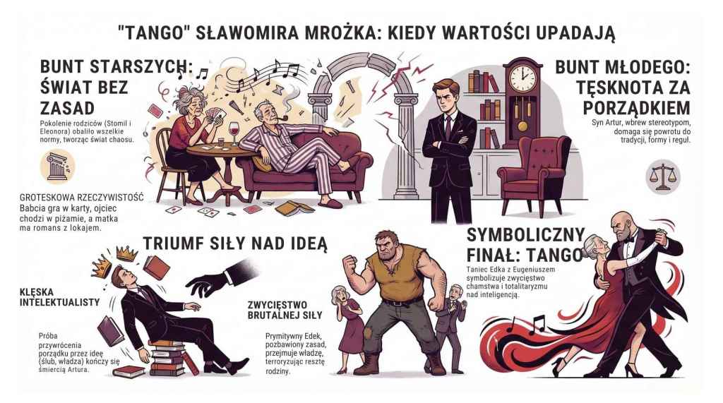 | Kontekst literacki | Teatr absurdu (elementy absurdalnej logiki, brak komunikacji) i groteska (mieszanie tragizmu z komizmem). |