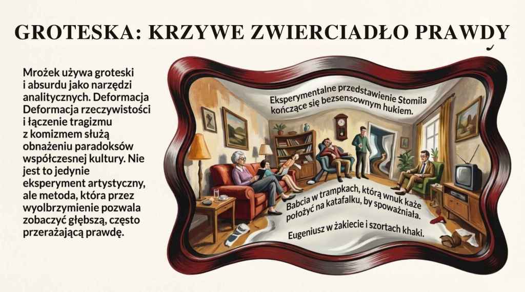 • Groteska służy Mrożkowi do demaskowania absurdu i chaosu, które kryją się pod cienką warstwą pozornej normalności. Świat w jego dramatach jest celowo wykrzywiony, aby pokazać jego prawdziwe, nielogiczne oblicze.
