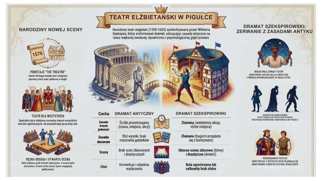 Eliminacja chóruWyeliminowanie chóru jako elementu komentującego wydarzenia i nadającego ton moralny utworowi.Funkcję komentującą i interpretacyjną przejmują monologi wewnętrzne bohaterów lub dialogi innych postaci; brak zbiorowych komentarzy.W dramacie antycznym chór był nieodzowny – wprowadzał w historię, oceniał czyny bohaterów i objaśniał sens wydarzeń.Monologi Hamleta, monologi Makbeta (np. „Życie jest tylko przechodnim półcieniem” po śmierci żony).Zmusza odbiorcę do samodzielnej interpretacji postaw moralnych bohaterów i zwiększa subiektywizm przekazu.